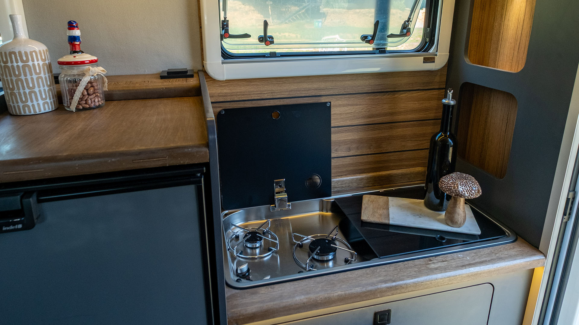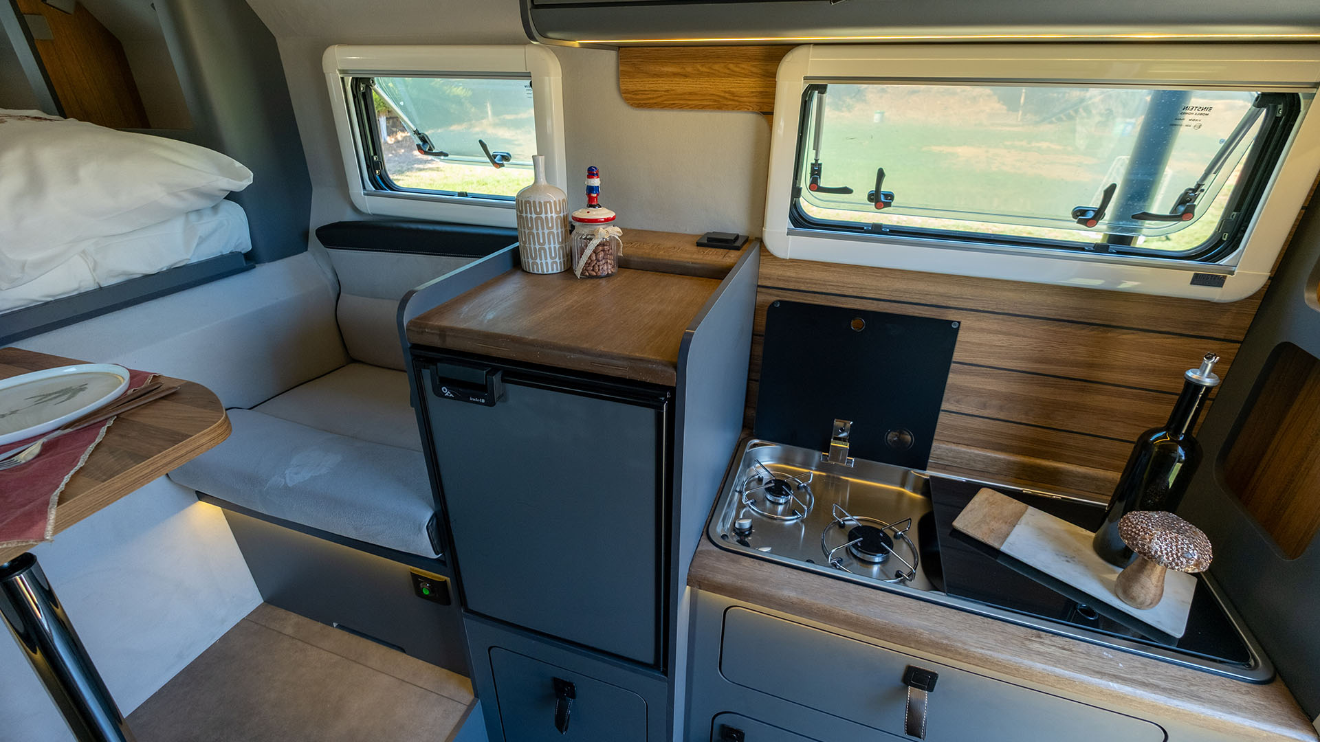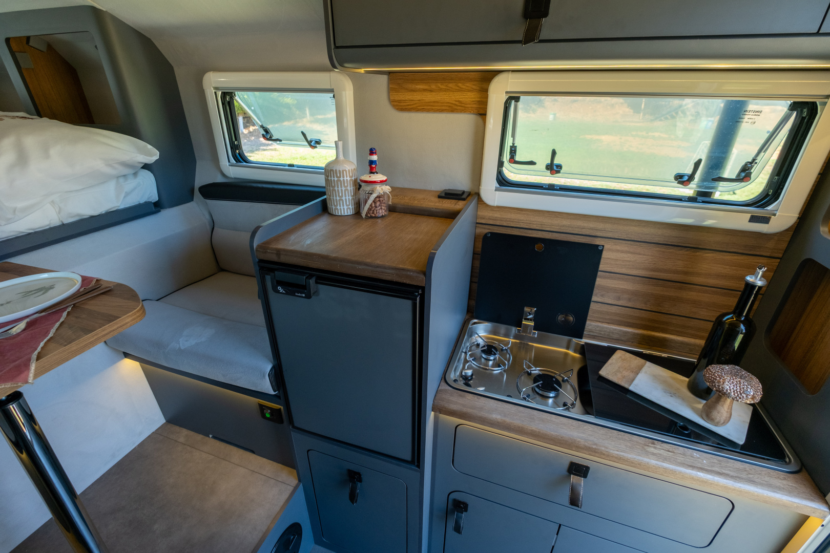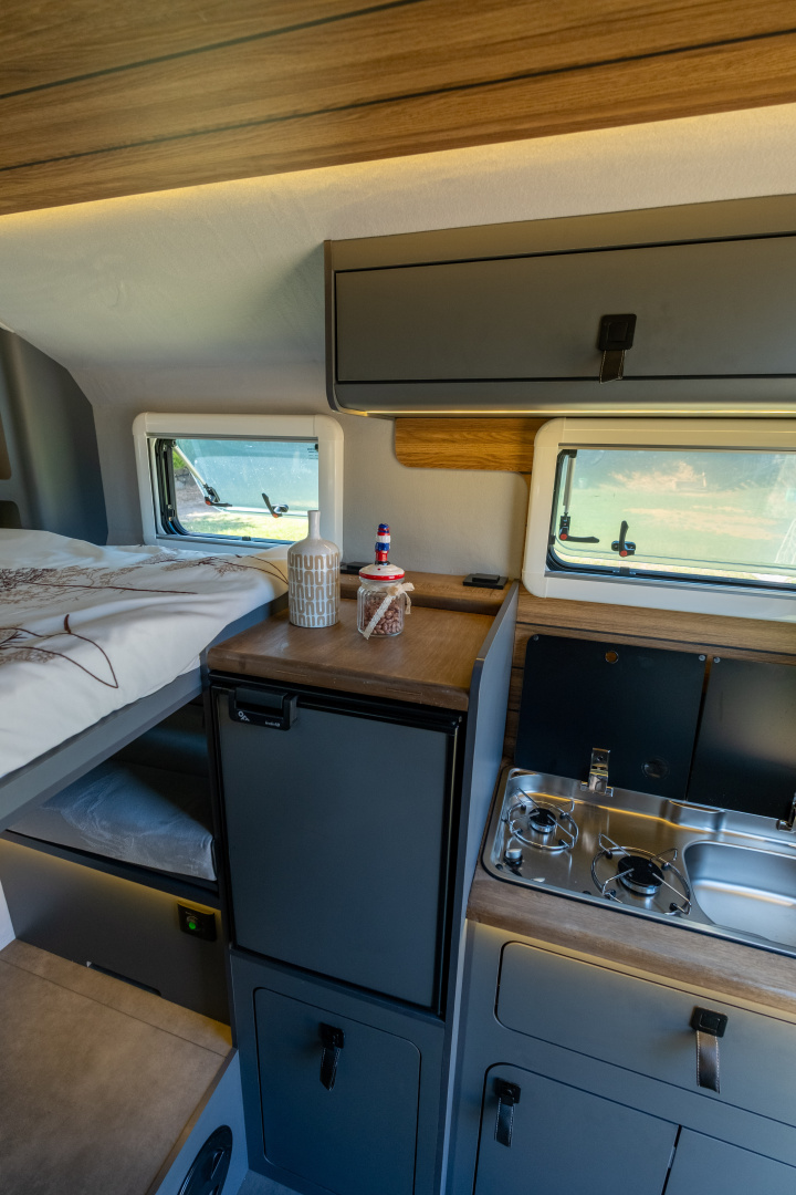 🔹 Komfortní kuchyň – Gladiator SM je vybaven 42-litrovou lednicí Thetford s mrazákem, velkým 2-plotýnkovým sporákem a rozšířeným úložným prostorem pro potraviny a vybavení.