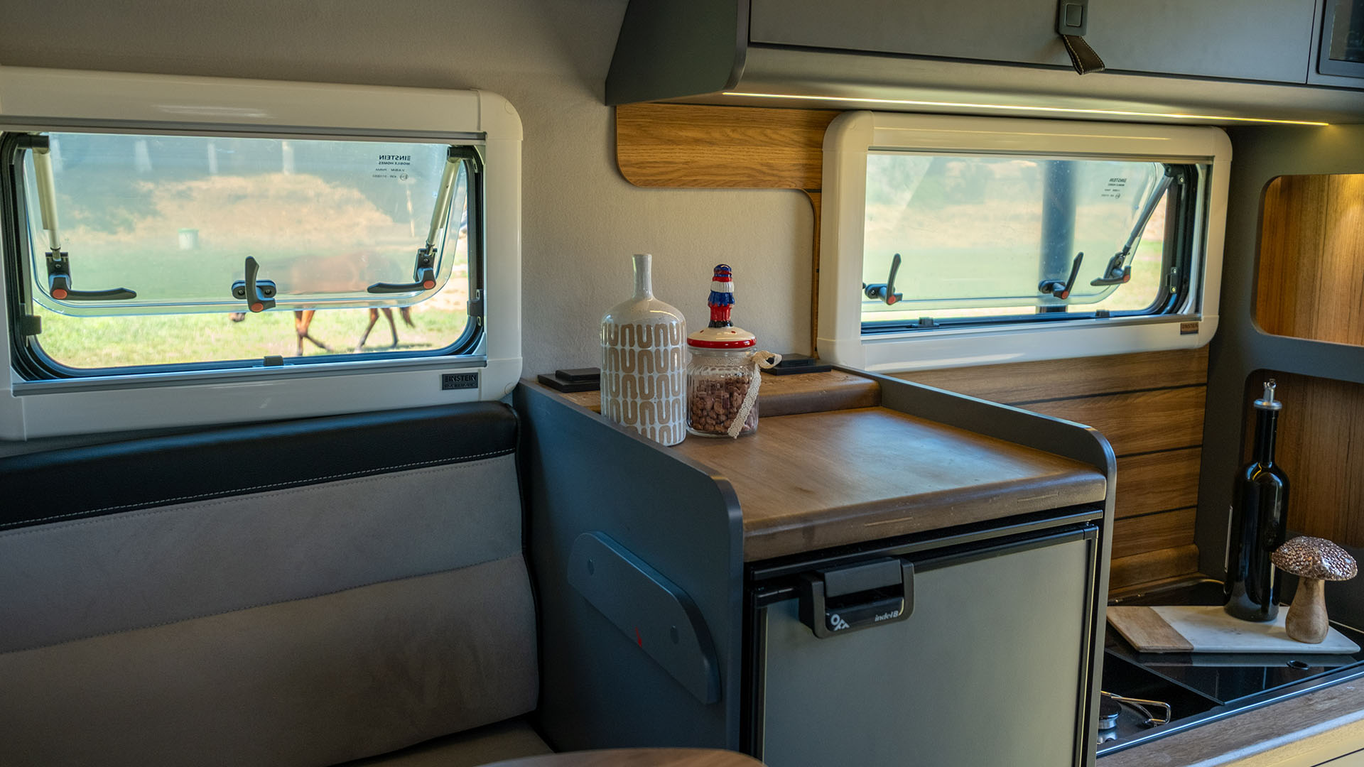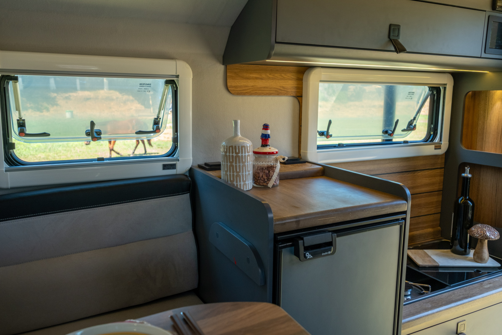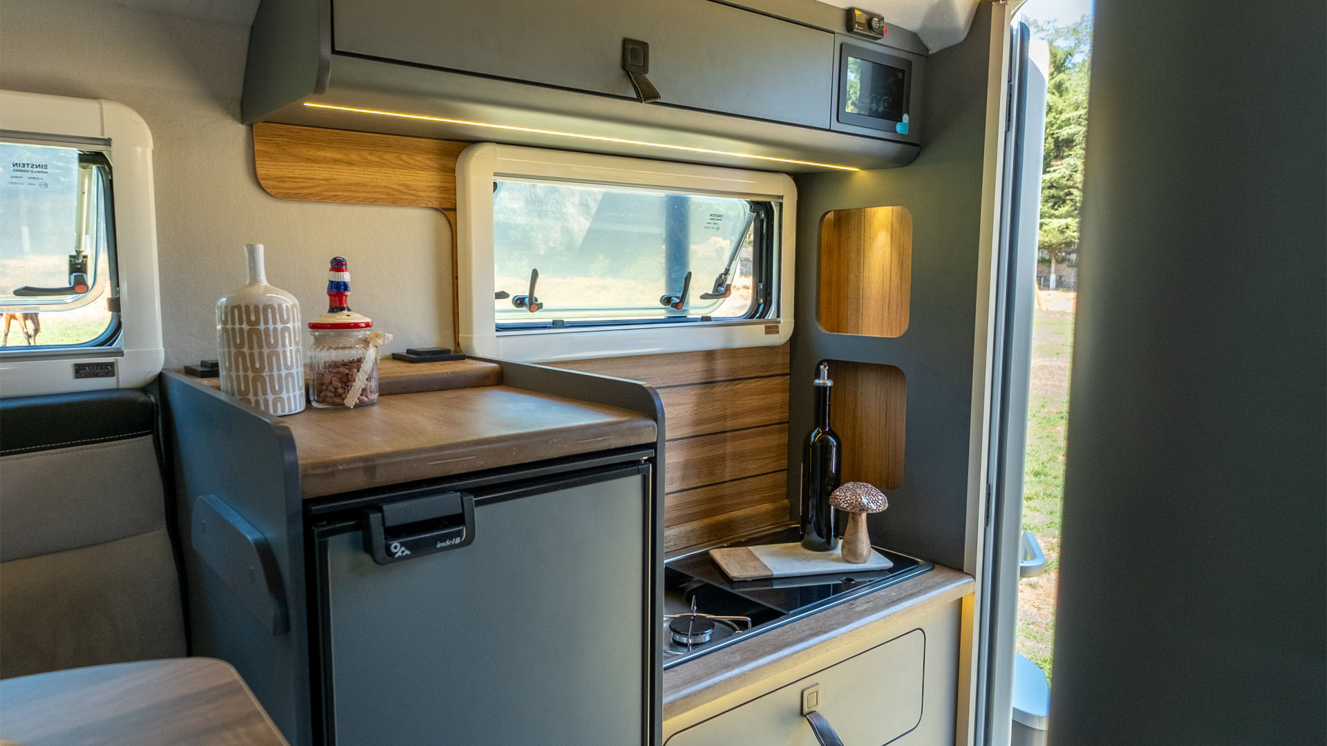 🔹 Komfortní kuchyň – Gladiator SM je vybaven 42-litrovou lednicí Thetford s mrazákem, velkým 2-plotýnkovým sporákem a rozšířeným úložným prostorem pro potraviny a vybavení.